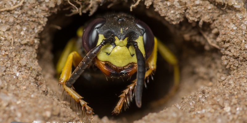 This is one of our largest species of solitary wasp (up to 18mm) that that hunts honey bees, which is the origin of the name bee-wolf (also sometimes referred to as bee-killer wasp). It lives in sandy places such as sand dunes, heathland and sand pits, where it can dig its 1m long burrow into an exposed area of sand, at the end of which are multiple chambers (up to 30) in each of which is up to 5 bees are stored and an egg laid. Each female bee can collect up to 100 bees in its adult life to feed its young. These honeybees have not been killed, but just paralysed, and covered with coating to prevent fungal growth ensuring the bees are fresh when the larva hatches and eaten alive! In some countries they are important predators of bees, but not in the UK.