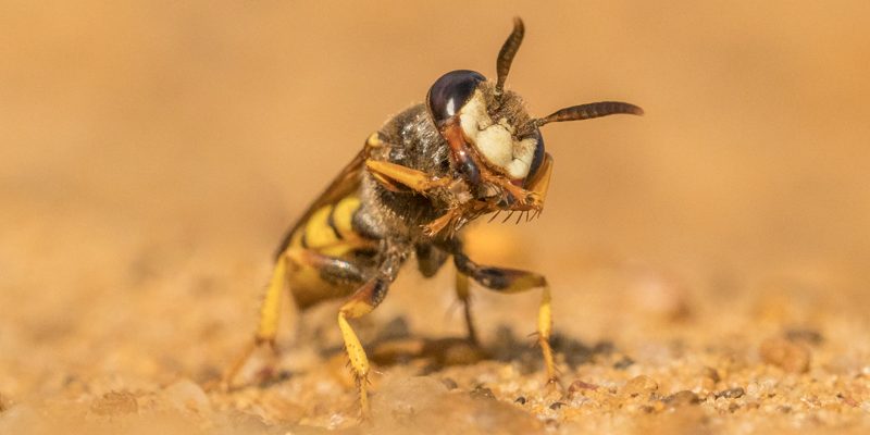 I then headed further into the reserve and after a brief glimpse of an Ammophilia caterpillar hunting wasp, I found another of my target species, a bee wolf. I have written about these predatory solitary wasps before and it is always a treat to see them. They were just warming up and I managed a few shots of them.